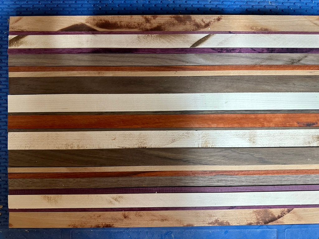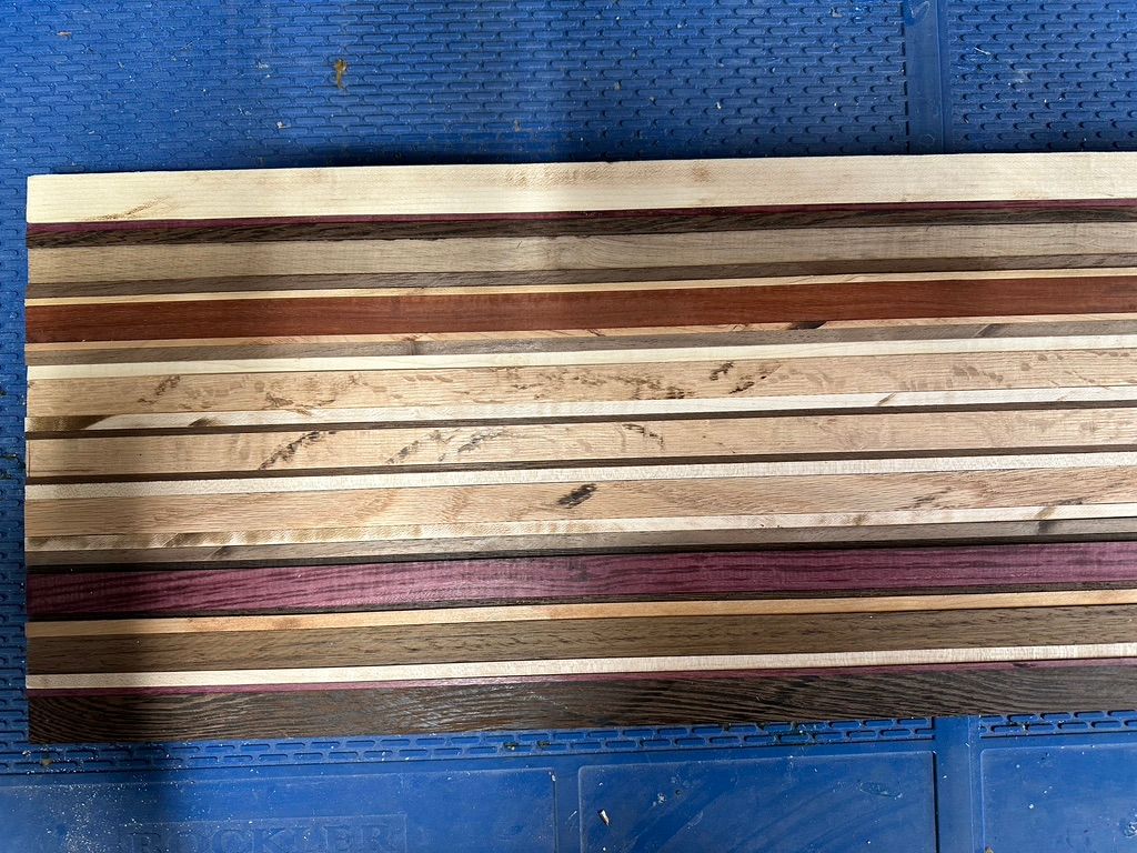 Then you horse around for a little while, laying out your strips in various patterns until they're between 11 and 12" wide, which is how wide your semi-pro planer can manage and is therefore as wide as you can realistically make a board. Oh, you should also like the pattern. If you don't find the pattern pleasing, fiddle around until you do!