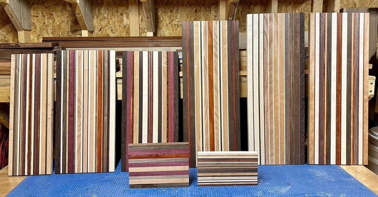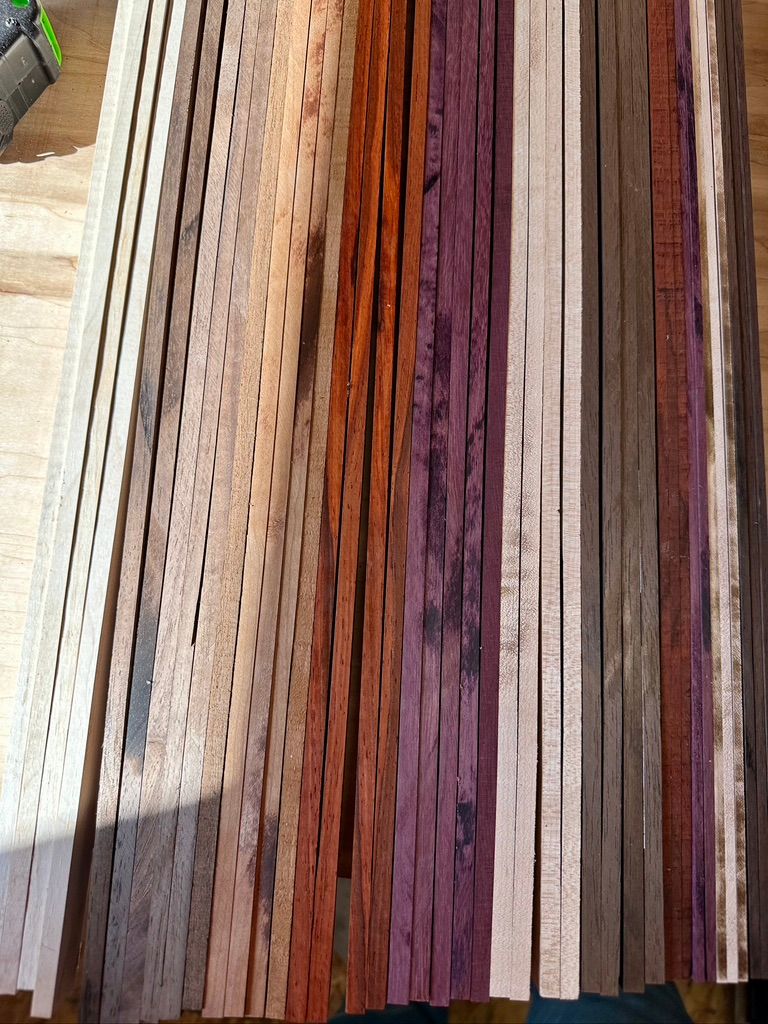 Actually, the first thing you do in this specific case is build a rolling stand for your new portable table saw with which you will cut a bunch of wood planks into very small strips. But I digress. You take some interesting wood (local reclaimed wood, some exotics that you buy when you find them on sale) which you have collected for a while and you make that wood into very small chunks indeed.