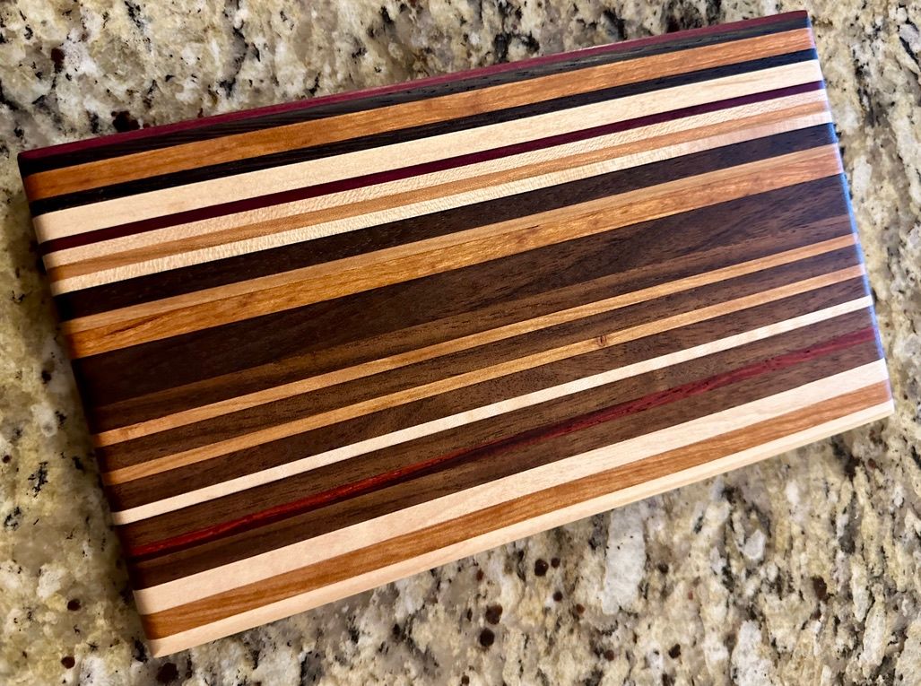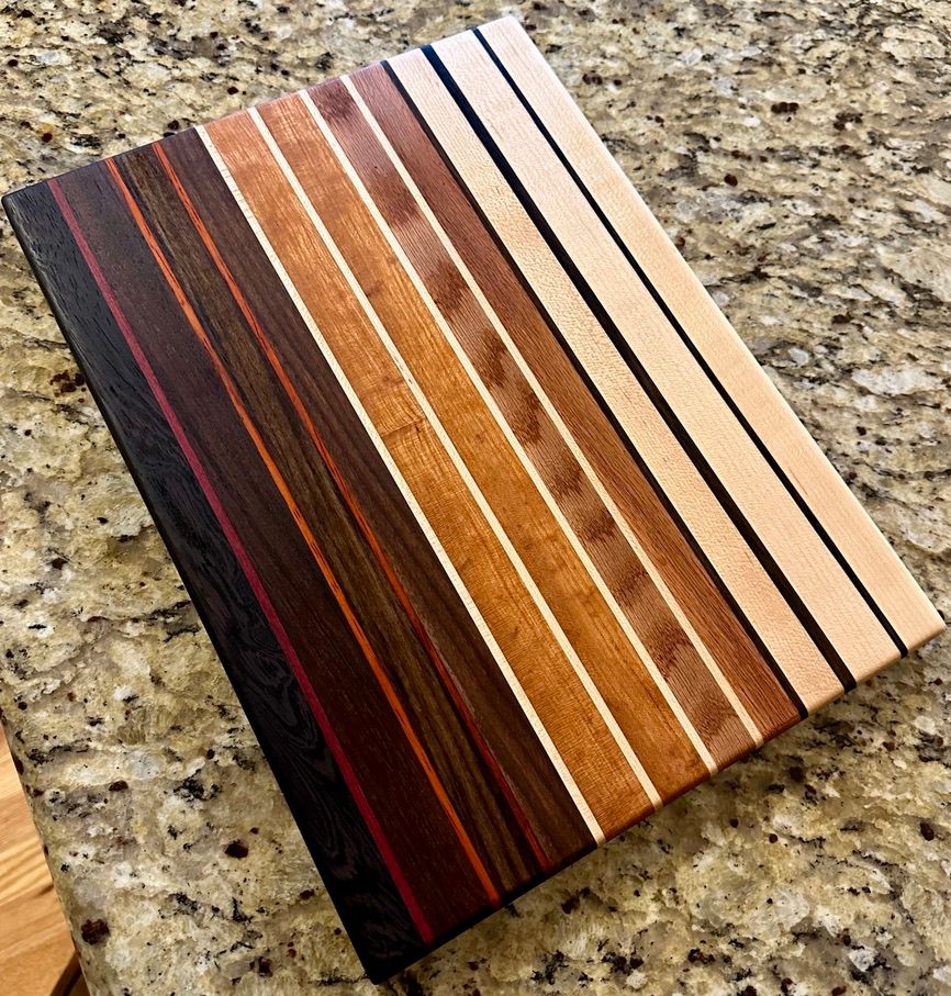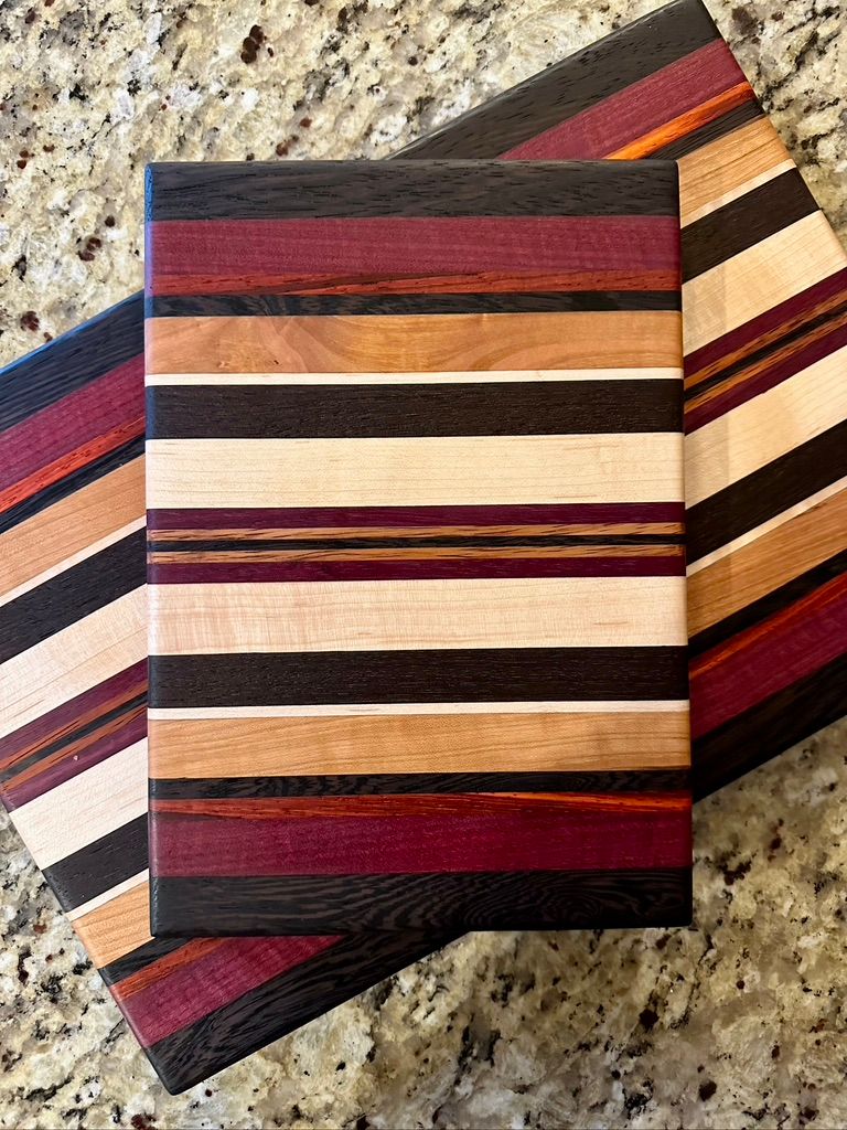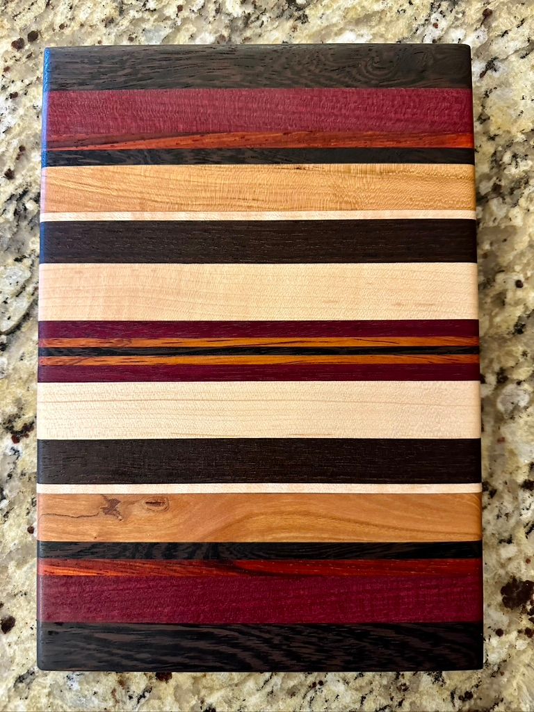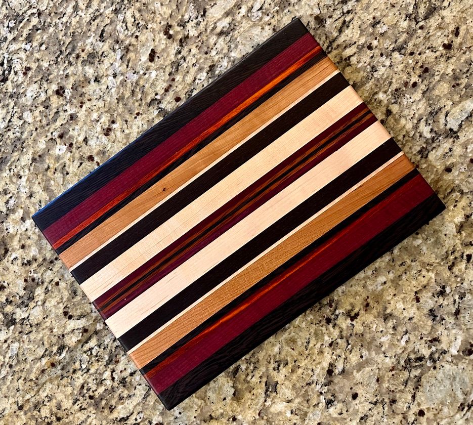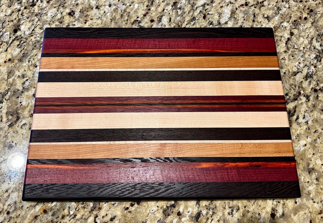 Carmen features bold Wenge, Purpleheart, and Padauk offset by some rich Peruvian Walnut and local Michigan Maple. The full size Carmen board is SOLD. The smaller charcuterie board is available.