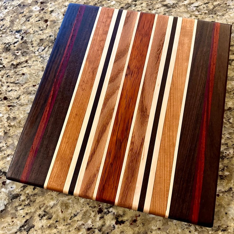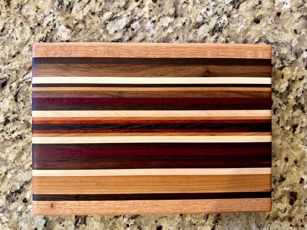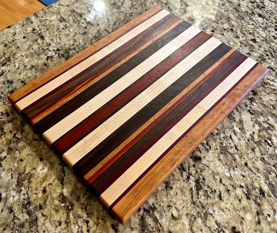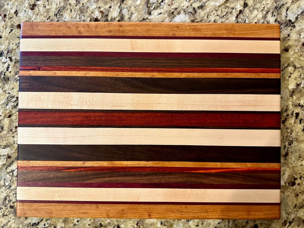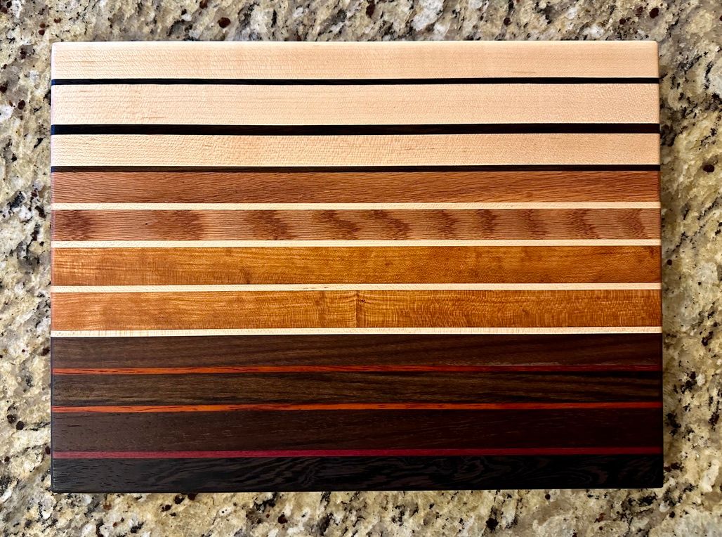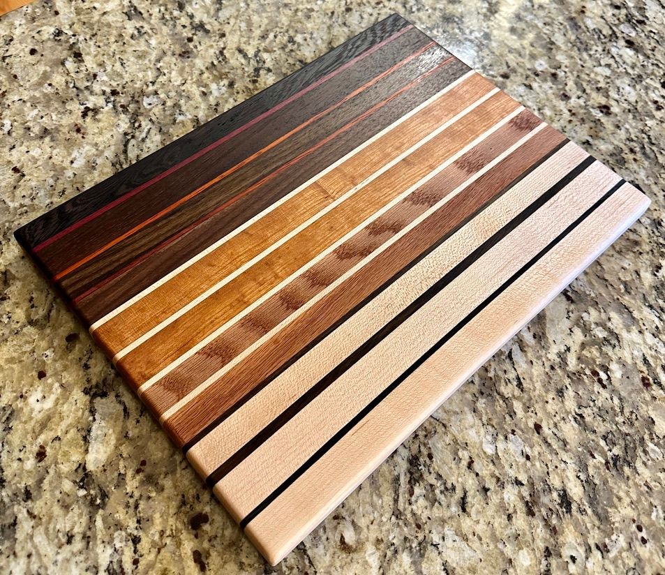 Walnut, Cherry, Red Oak, Maple, Padauk, and Purpleheart. The rich pinstriping reminds me of a race car. I have also a one-off "square" (~11x12") version of the High Gear pattern.