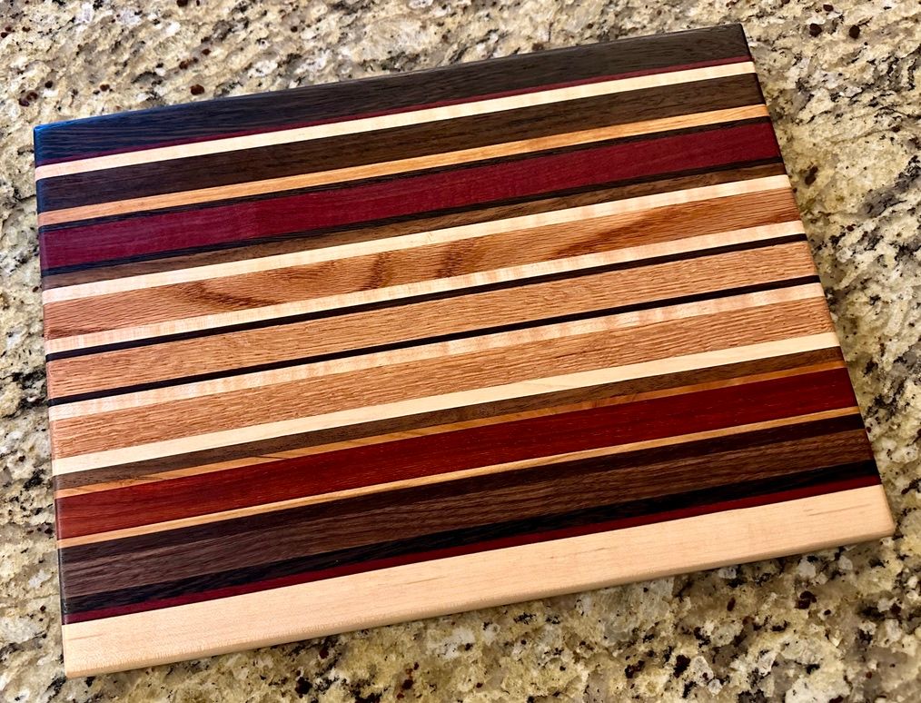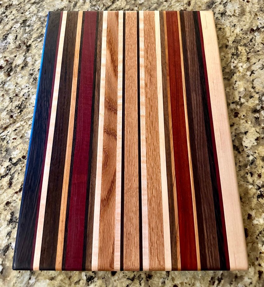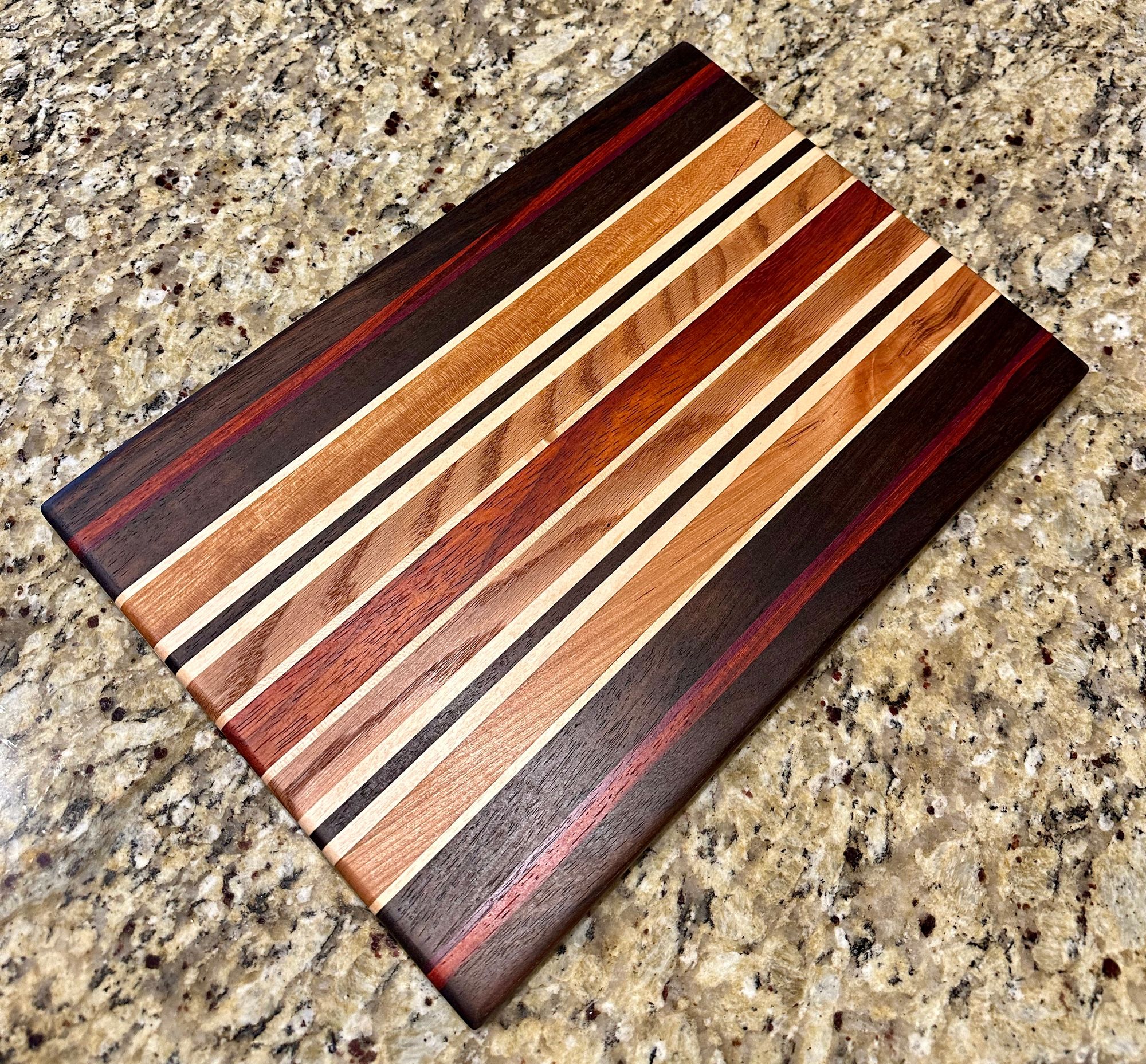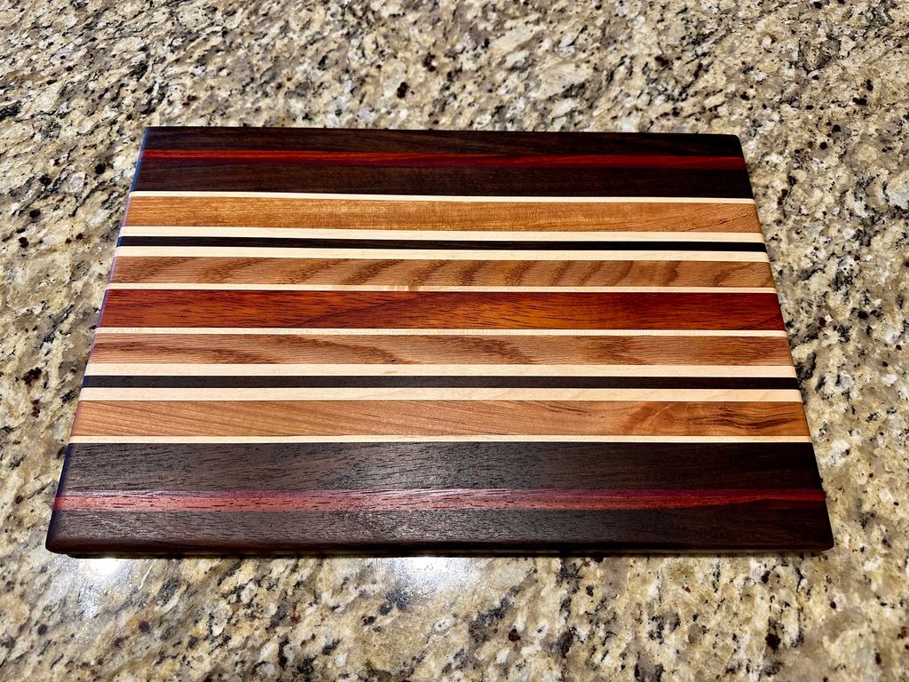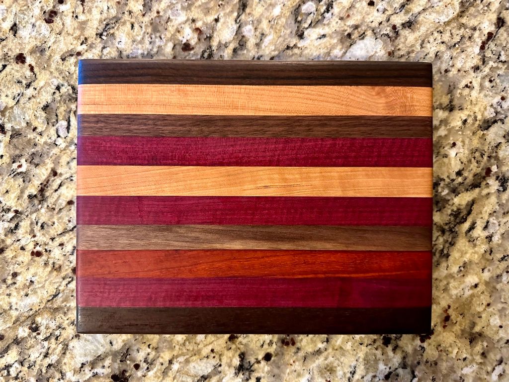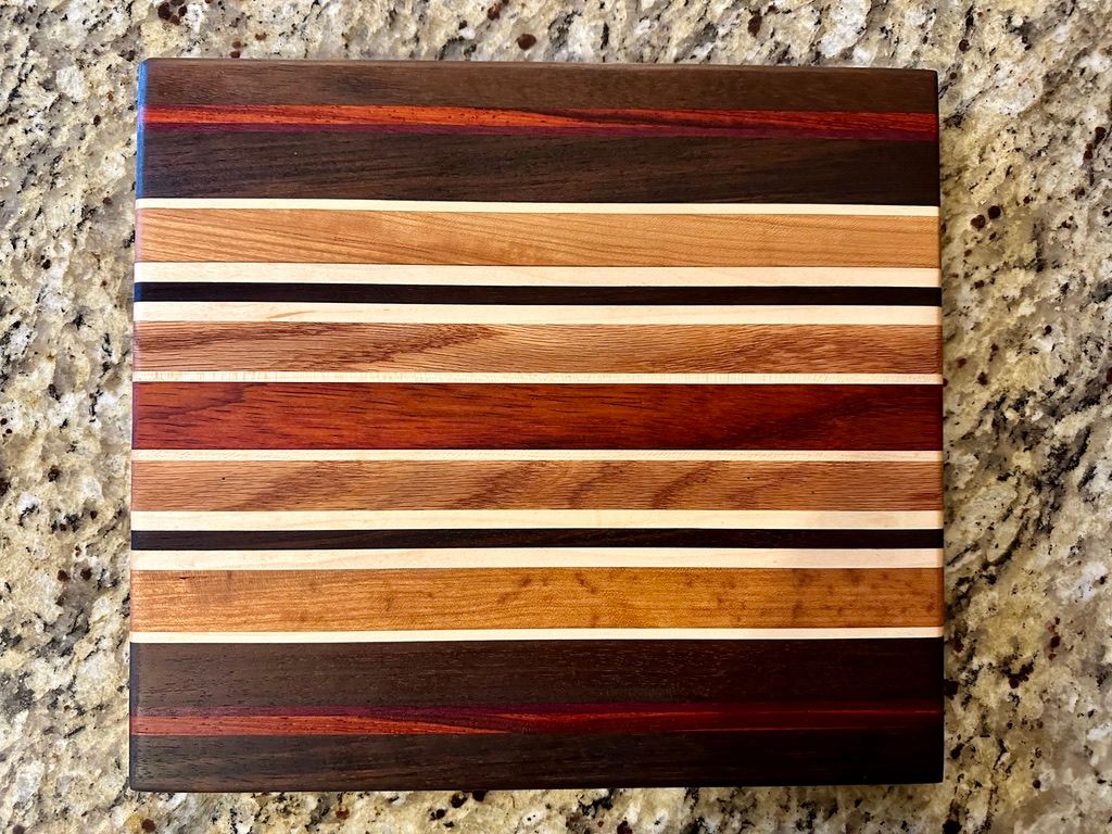 Walnut, Cherry, Red Oak, Maple, Padauk, and Purpleheart. The rich pinstriping reminds me of a race car. I have also a one-off "square" (~11x12") version of the High Gear pattern.