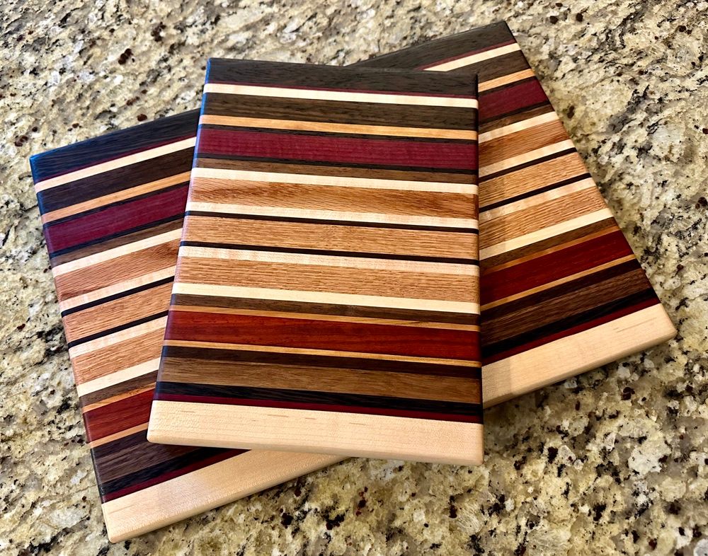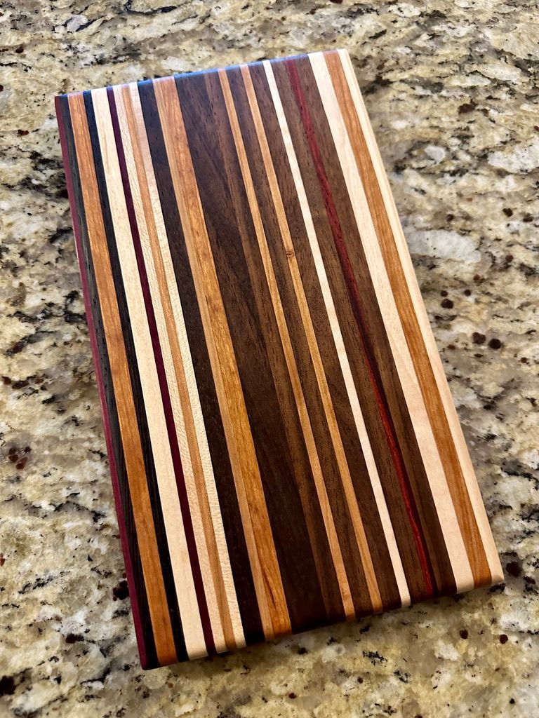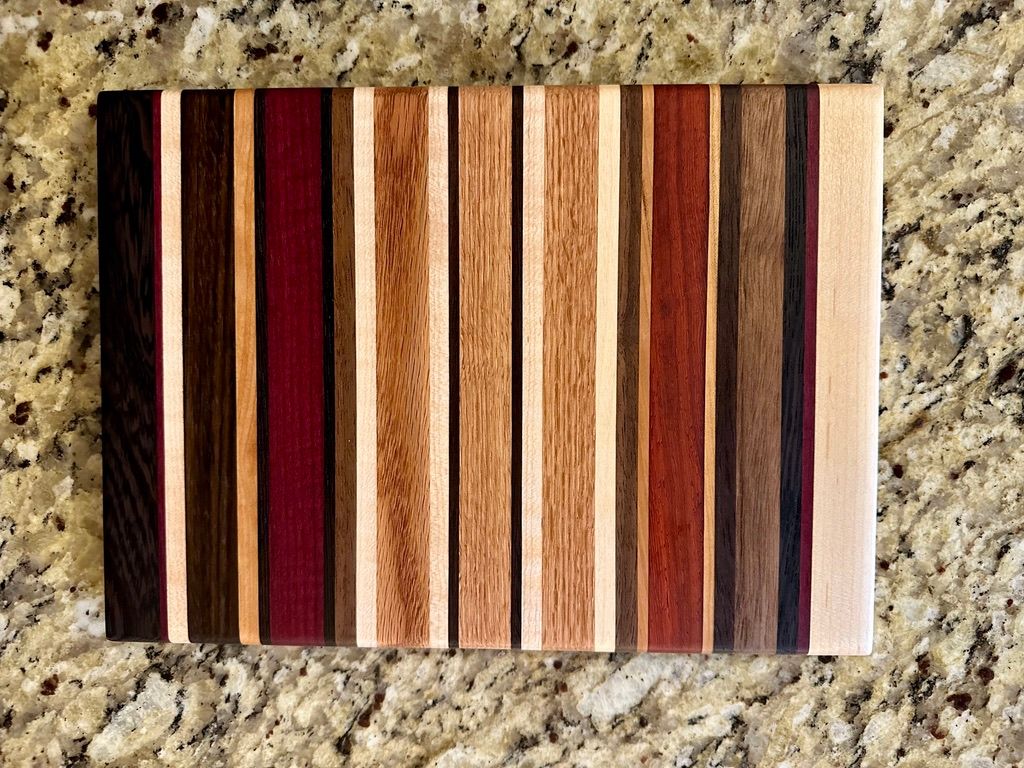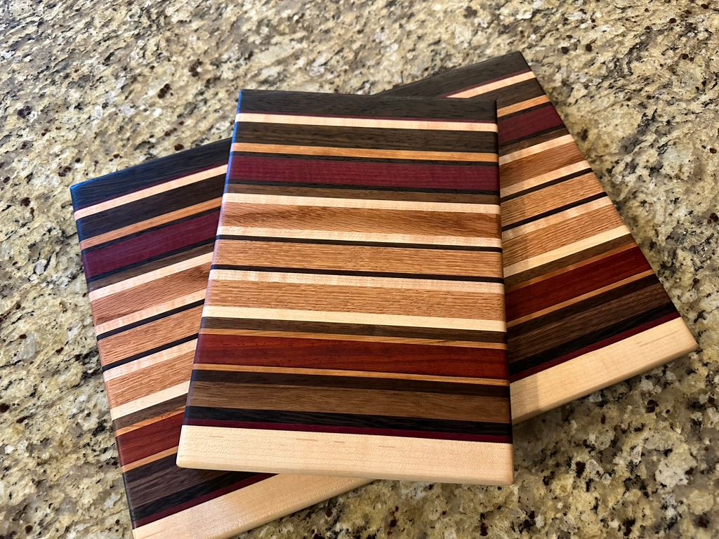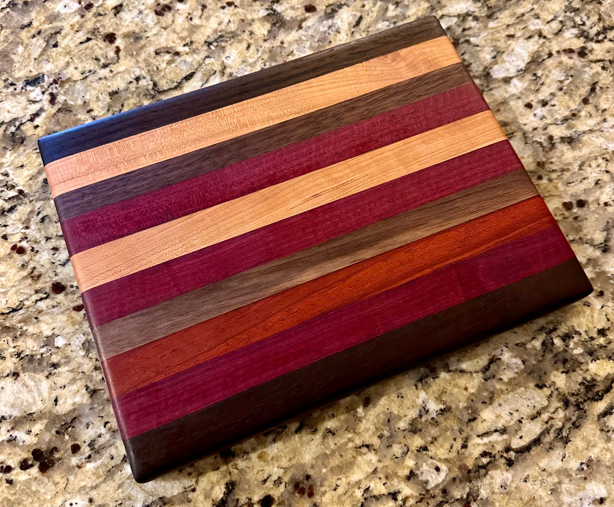 Walnut, Cherry, Red Oak, Maple, Padauk, and Purpleheart. The rich pinstriping reminds me of a race car. I have also a one-off "square" (~11x12") version of the High Gear pattern.