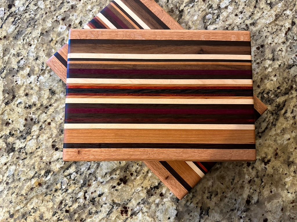 Here are the boards from the Fall 2023 series, their names, and any other pertinent information. The boards are either "Full Size", which is around 15" x 11.25", or they are "Serving Boards", of various sizes (usually 6-8" x 9-11") but mostly intended for charcuterie presentation. They are oiled with multiple coats of food-safe mineral oil and butcher block conditioner. If you'd like to buy one, they come with a homemade wax "refresher" coating so you can touch up the finish on their own.