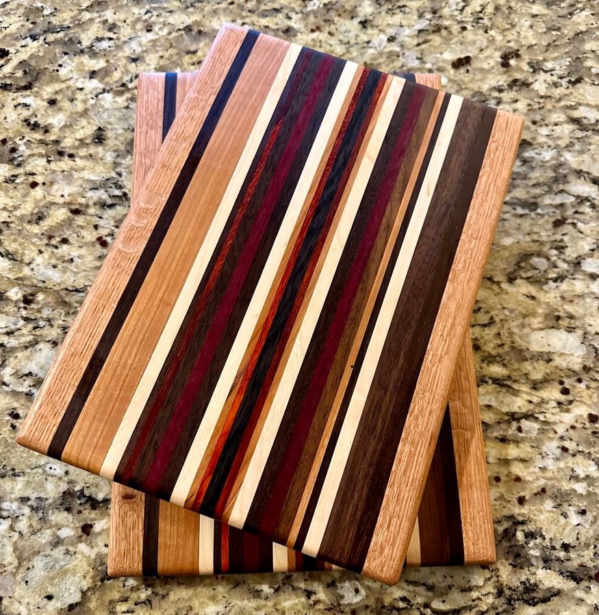 A matched pair of serving boards, approximately 8x10" in a rich, buttery looking texture formed from a symmetric arrangement dominated by the local Cherry, Oak, and Walnut.